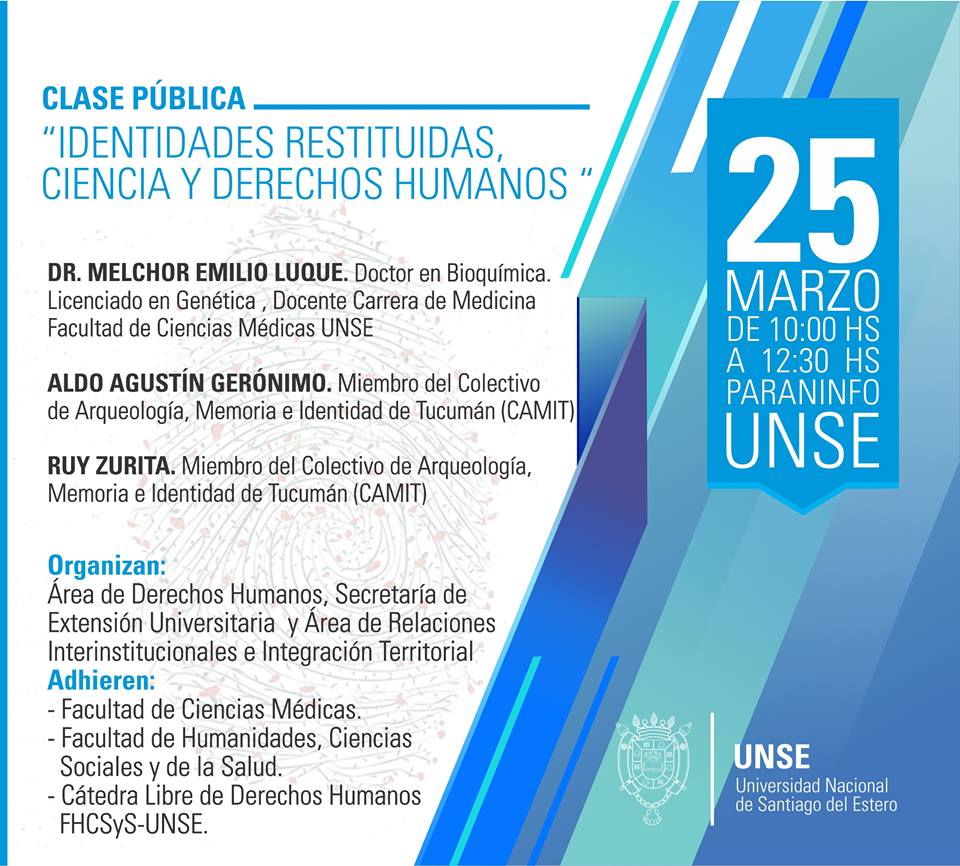 El 25 de Marzo la  Clase Pública desarrollada por Miembros del Colectivo de Arqueólogos por la memoria Tucumán CAMIT, Ruy Zurita y Julia Lund  y  el Docente de la  Facultad de Ciencias Medicas- UNSE. Dr.Emilio  Luque hacen lugar a la palabra, yendo detrás de la pregunta por la IDENTIDAD.